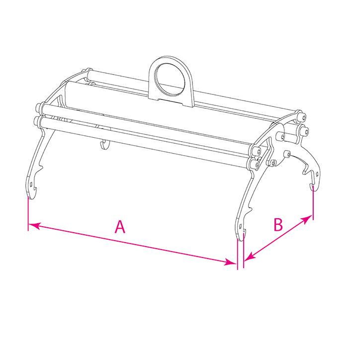 Profil-Formblechkonstruktion mit mittiger Aufhängeöse und vier an die Hubschächte angepasste Aufnahmen. Der Öffnungs- und Schließmechanismus wird über einen Drehriegel manuell gesichert.