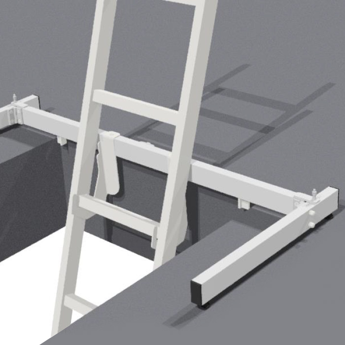 Die mobile Leitereinhängevorrichtung ist eine handliche und leicht zu transportierende Vorrichtung, um an Wartungsschächten eine temporäre Einhängemöglichkeit für Leitern zu schaffen.