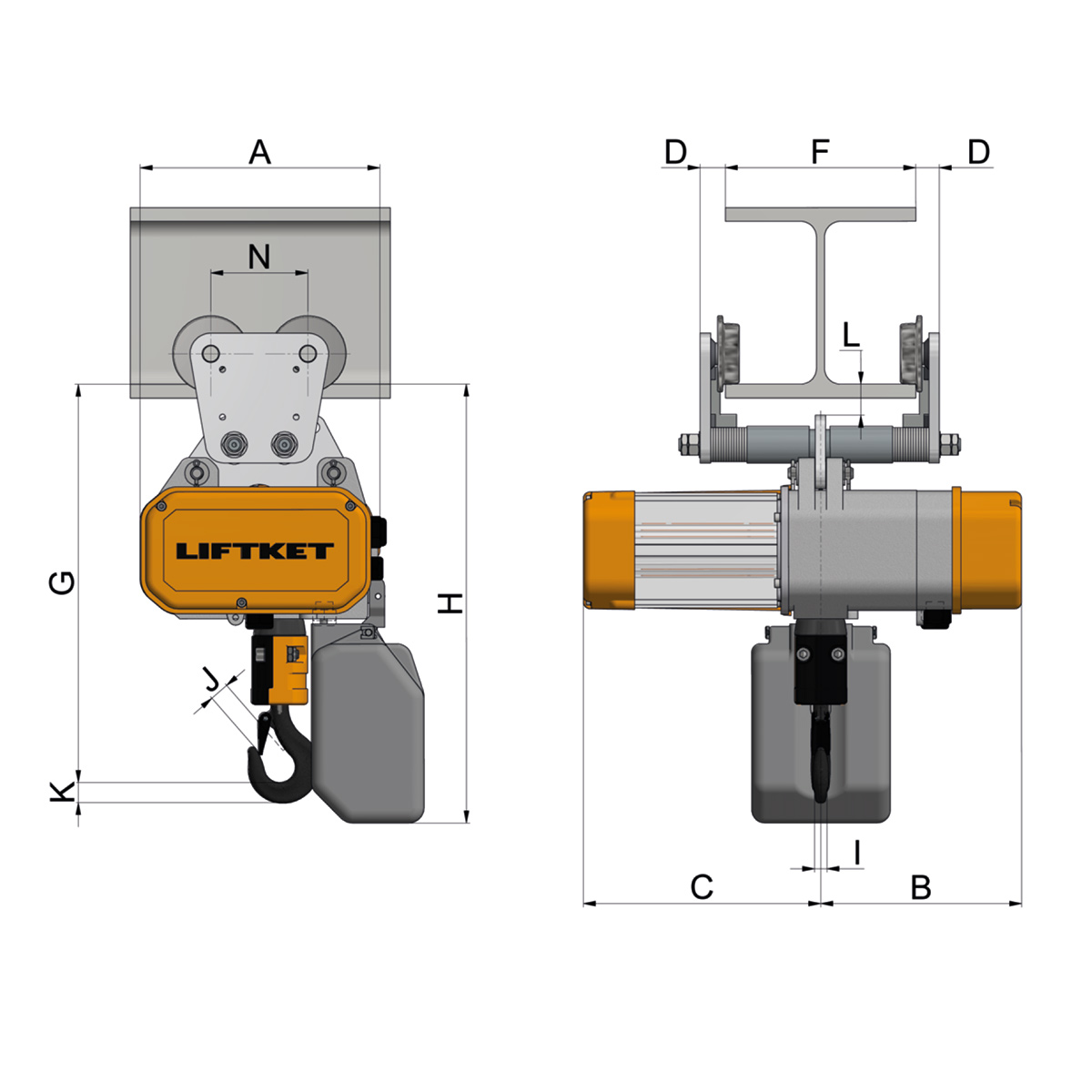 The Speedline model series can be specified with suspension (eye, hook suspension), beam width and manual or electric trolley. Lifting heights of up to 20 m are possible with the Speedline, covering most industrial applications. The 11 different models cover lifting capacities from 125 kg to 5000 kg. Depending on the load, the chain hoists offer different rated speeds up to a maximum of 10 m/min. They each have two speed levels. The series, which is optimized for fast