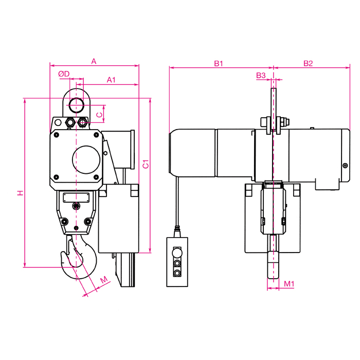 Small overall dimensions and low headroom due to compact construction. Helical gearing ensures high load capacity and low noise level at all speeds. All gear wheels are case-hardened and micro-finished. The disc brake reacts quickly and safely at lowest wear. The hoist is resistant against dust and weather due to its fully enclosed housing and a specially sealed brake. The low-wear load chain according to DIN EN 818 is surface-hardened and galvanised.