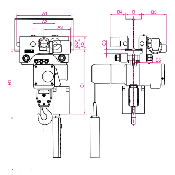 Small overall dimensions and low headroom due to compact construction. Helical gearing ensures high load capacity and low noise level at all speeds. All gear wheels are case-hardened and micro-finished. The disc brake reacts quickly and safely at lowest wear. The hoist is resistant against dust and weather due to its fully enclosed housing and a specially sealed brake. The low-wear load chain according to DIN EN 818 is surface-hardened and galvanised.