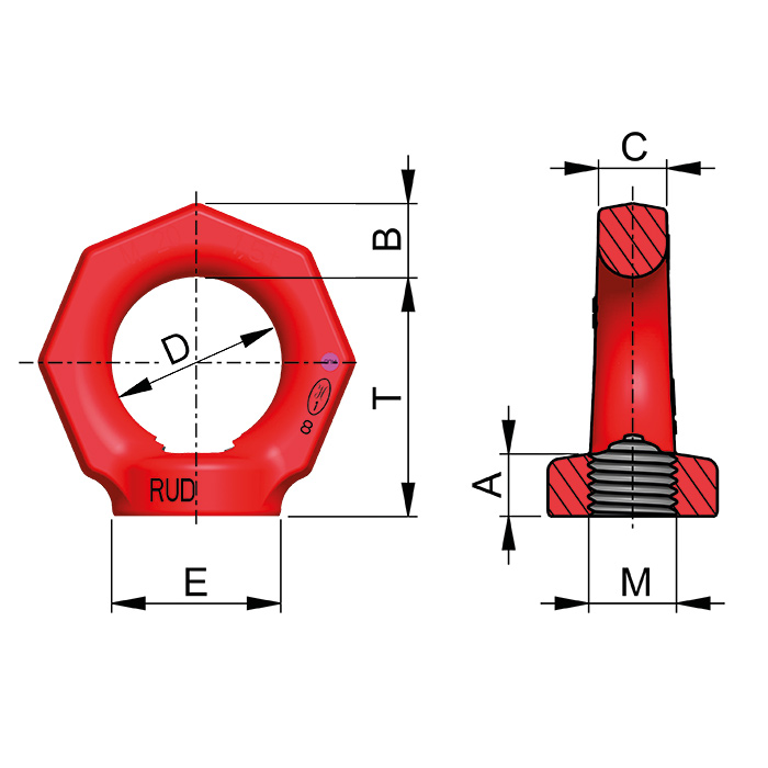 The High Strength Eye Nut RM is a robust and versatile lifting component designed for secure load handling in industrial, construction, and transport settings. Manufactured from high-grade alloy steel, this eye nut offers superior strength, durability, and resistance to wear, making it ideal for demanding lifting and rigging applications. Threaded internally, the RM eye nut is designed to be screwed onto compatible bolts or studs, providing a reliable anchor point for hooks, shackles, and lifting slings. Its solid forged construction ensures it can withstand high tensile loads without compromising safety or performance. The RM model is suitable for both vertical and angular lifting operations and is engineered to comply with rigorous industry safety standards. Clear markings for load limits and thread specifications make it easy to identify and use in complex lifting systems. Whether in warehouses, shipyards, or manufacturing environments, the High Strength Eye Nut RM delivers consistent performance and peace of mind in heavy-duty lifting tasks. • Significantly higher load carrying capacity (compared to DIN 580/582) with vertical loading• Wide range of threads• Clear marking of the minimum load capacity• 8-corner shape G