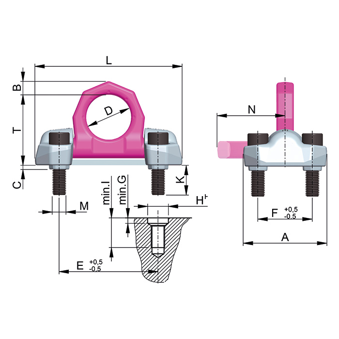 The VRBG Lifting Ring is a high-performance lifting point designed for the secure and flexible handling of heavy loads in industrial and construction settings. Engineered for versatility, the VRBG features a rotating load ring that allows full rotation under load, ensuring the optimal direction of force during lifting, rigging, or assembly tasks. Manufactured from premium-grade materials and built to withstand high load capacities, the VRBG is ideal for dynamic lifting scenarios where both strength and adjustability are essential. Its design allows for a wide range of applications, including lifting at angles, rotation during load movement, and use with chain slings or hoists. The VRBG is easy to install and integrates seamlessly into existing lifting systems. Thanks to its full rotational capability and precision-machined components, it delivers both safety and efficiency under high-stress conditions. It is well suited for use in construction, engineering, transport, and machinery manufacturing, where reliable and adjustable lifting points are critical. Whether used as a fixed anchor or for flexible load manipulation, the Lifting Ring VRBG ensures secure, smooth, and controlled lifting operations with full compliance to industrial safety standards. VRBG 10 and 16: Ring bracket thread VRBG 31,5 and 50: Ring bracket on plate • applicable down to -20°C • Load also permissible at 90° to the ring plane • Gentle force transmission over several points • Suspension bracket can be swivelled up to 180°