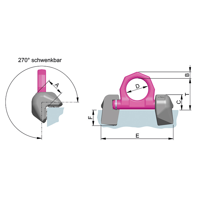 The VIP Lifting Ring for Edges is specifically engineered for secure lifting at critical edge positions where conventional lifting points may be unsuitable. Designed with moveable, tempered high-strength ring brackets, this lifting solution allows flexible alignment of the load while maintaining maximum safety and control. The adjustable ring brackets rotate and pivot to match the pulling direction, enabling a more efficient and secure transfer of force. This feature helps reduce stress on both the lifting point and the load, minimising wear and extending equipment life. The tempered material construction ensures superior durability, even under demanding conditions. Ideal for use on edges of containers, machinery, steel frames, and transport platforms, the VIP edge lifting ring is welded directly onto the load-bearing surface. Its compact yet strong design provides a reliable lifting point that can handle high loads in restricted spaces where edge access is necessary. Compliant with the highest safety standards, the VIP Lifting Ring for Edges with moveable ring brackets is a versatile and essential component for heavy-duty lifting operations in construction, manufacturing, engineering, and transport industries. • Placed on the edge it saves you half the number of lifting points • Forged ring bracket acc. to EN 1677-1, electromagnetically crack-tested, pink powder-coated. • Can be loaded in all directions • Safety factor 4 against breaking • Even distribution of induced forces due to 2-point anchoring • Very low profile due to slewable construction (270°) • Weld-on blocks and ring bracket are connected by a special radial clamping spring. • Easy adjustment of lifting ring • Ring bracket remains in desired position • Easy painting • No loose parts • No rattling • Safe welding process: Dimension E is guaranteed • Protected by patent Option: Ring bracket also available as single part (Price on request).