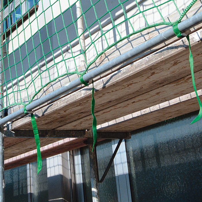 Knotless side protection nets conforming to EN 1263-1, safety net system U. Made from high tenacity polypropylene, approx. 5 mm in diameter, with integral surround rope and sown-on belt snap buckles at approx. 75 cm intervals. With GS test certificate 03006