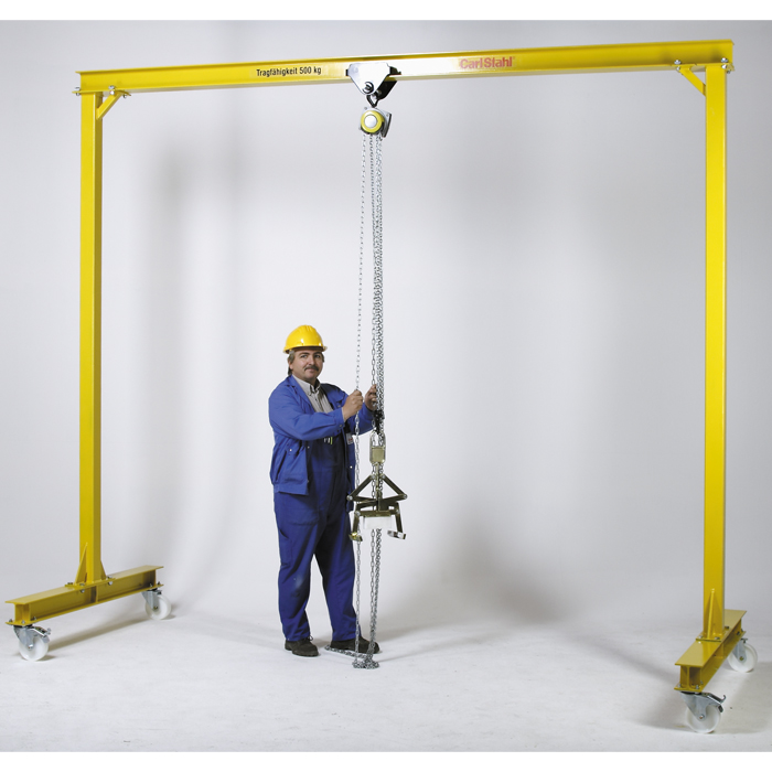 Load capacities from 50 kg to 5,000 kg and portal widths from 2 m to 6 m are available. BGV D6 must be observed when installing on site.