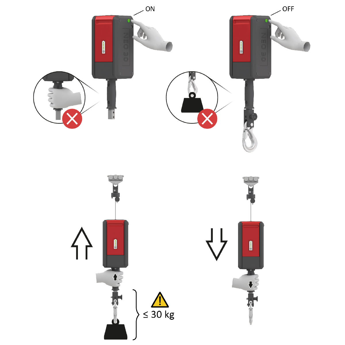 NEO 30 kan lyfta laster på upp till 30 kg säkert och exakt med en handrörelse från användaren. Ett brett urval av standardiserade lasthanteringsanordningar erbjuds tillsammans med NEO 30.