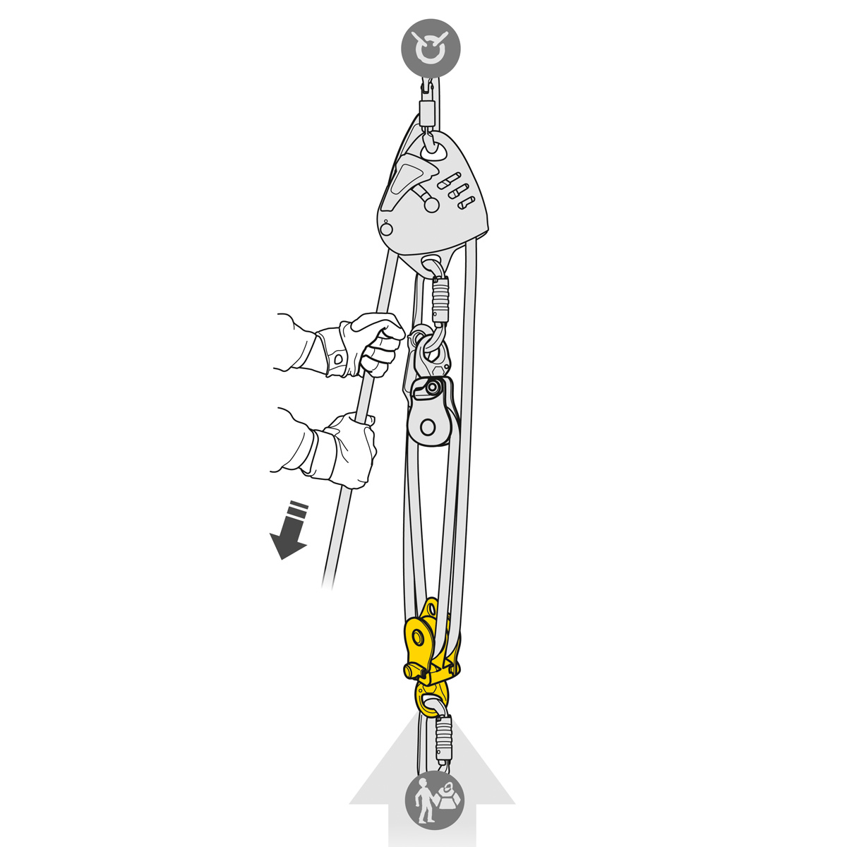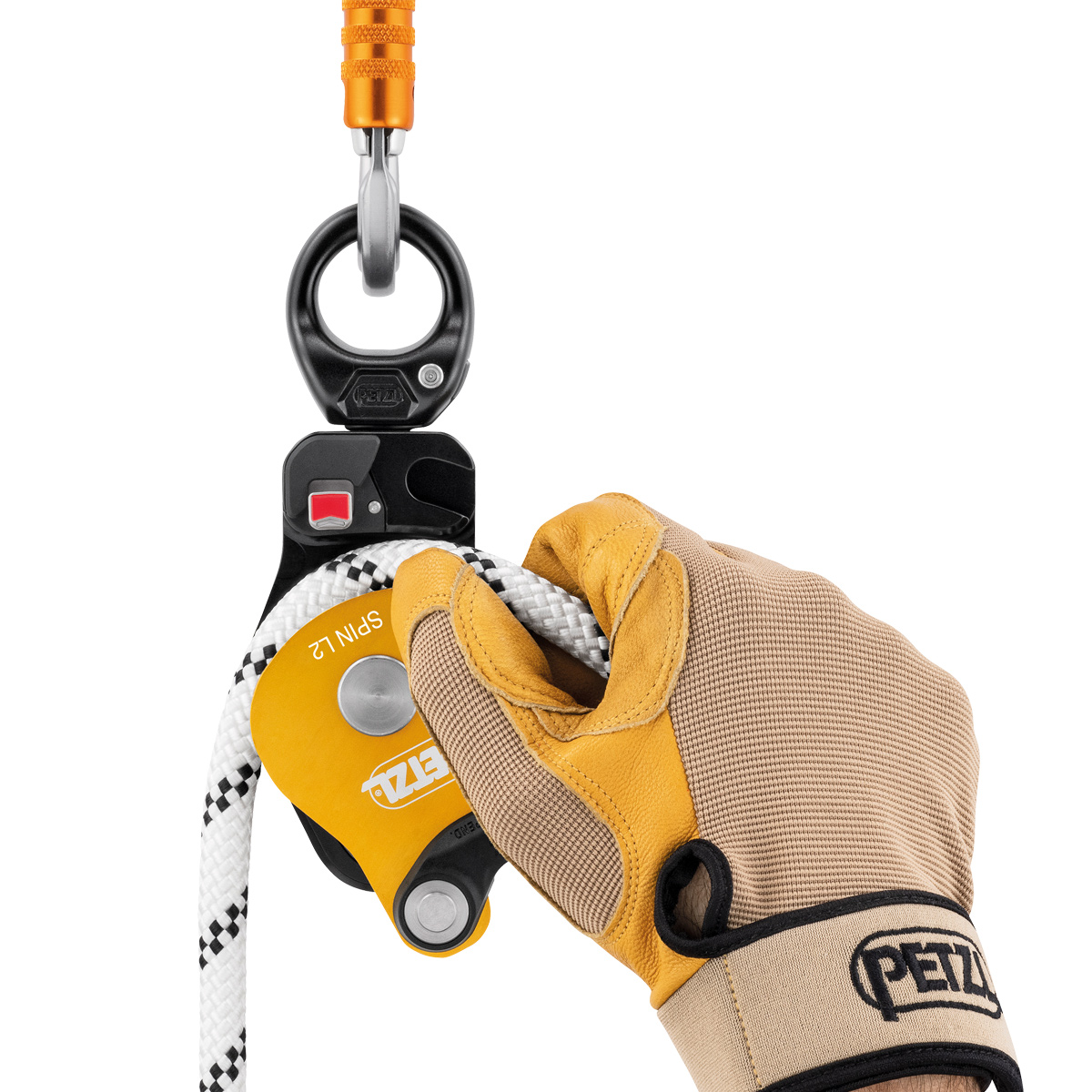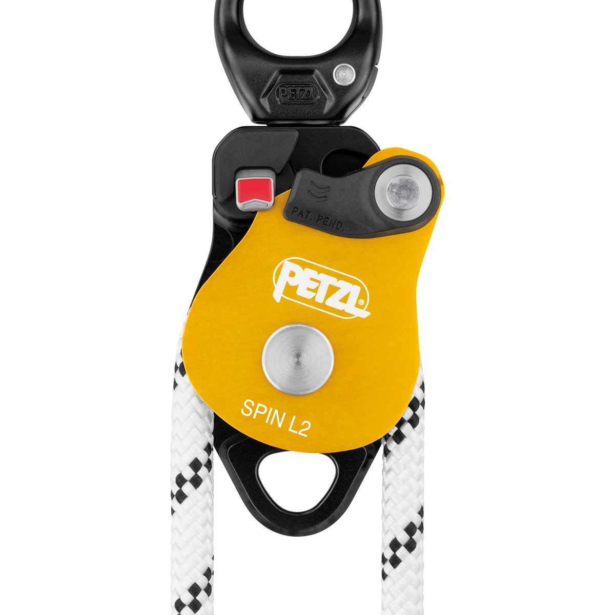 The SPIN L2 double pulley can be opened even when it is attached to the anchor point, facilitating the setup of pulley block systems and auxiliary ropeways. Thanks to the two parallel mounted sheaves and the additional attachment eye, the pulley allows the setup of various complex pulley block systems. The large track rollers with encapsulated ball bearings ensure excellent efficiency. Handling is facilitated by a swivel which allows alignment of the pulley under load and direct hooking of carabiners, ropes or slings.