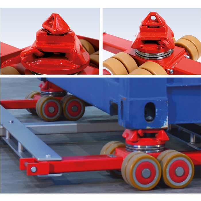 - Positive and non-positive locking between trolleys and containers (twistlock system) or only positive locking ("Weld-on Cone" system)